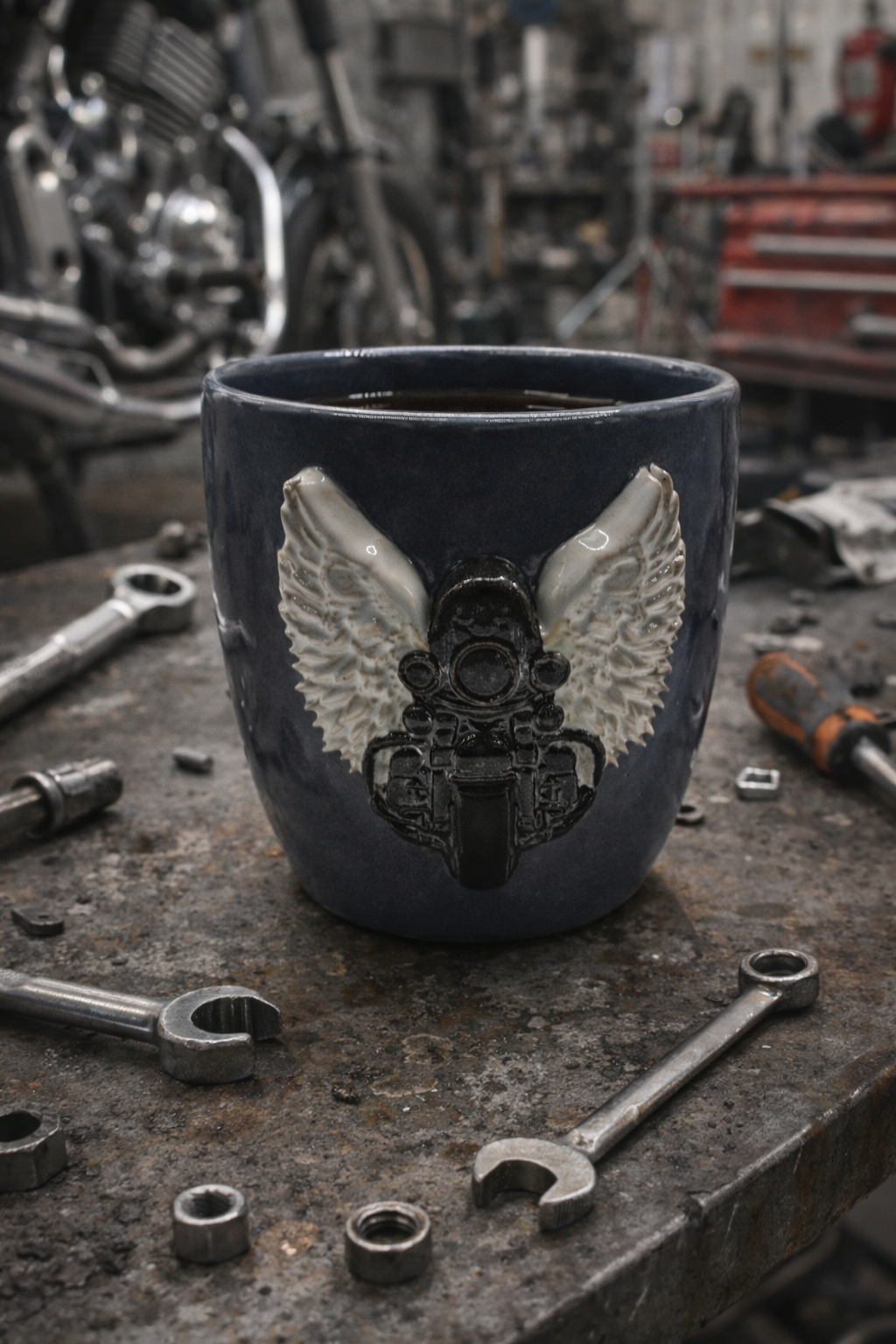 A Caneca Moto Alada é uma peça artesanal exclusiva, feita em cerâmica de alta qualidade, com aplicação em alto-relevo de uma motocicleta com asas abertas — símbolo de liberdade, velocidade e espírito aventureiro.