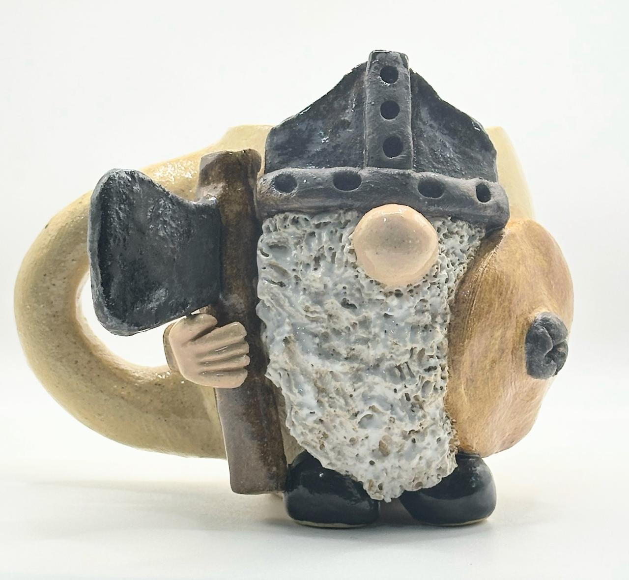 Essa caneca de cerâmica é uma homenagem aos lendários vikings – com seu machado em punho, escudo à frente e uma poderosa barba branca de respeito.