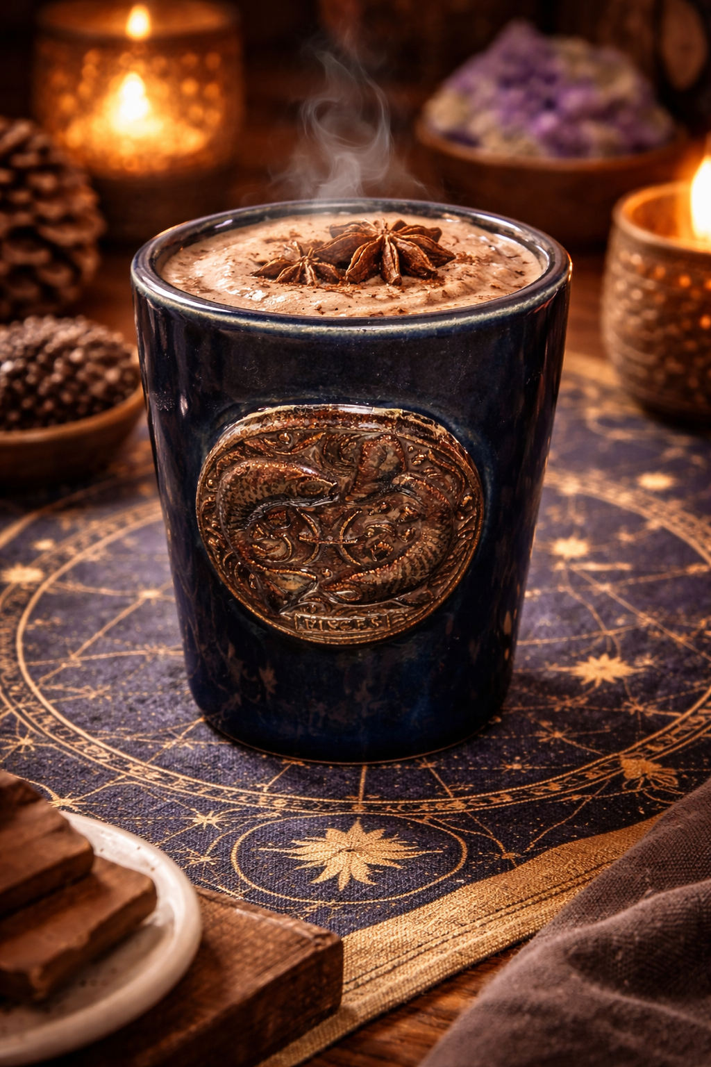 Com esmaltação em azul profundo brilhante e medalhão em alto-relevo representando o símbolo de Peixes, este copo traduz a essência sonhadora e espiritual do signo.