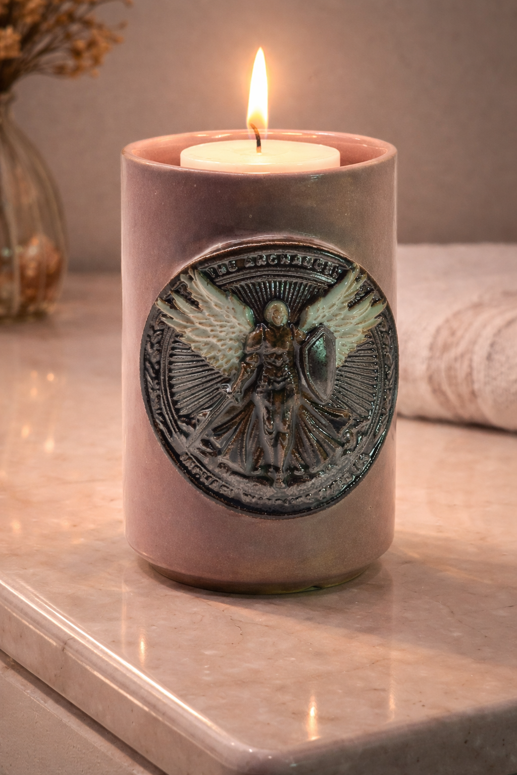 Este porta vela artesanal traz a imagem de São Miguel Arcanjo em alto-relevo — símbolo de defesa, coragem e vitória contra o mal.