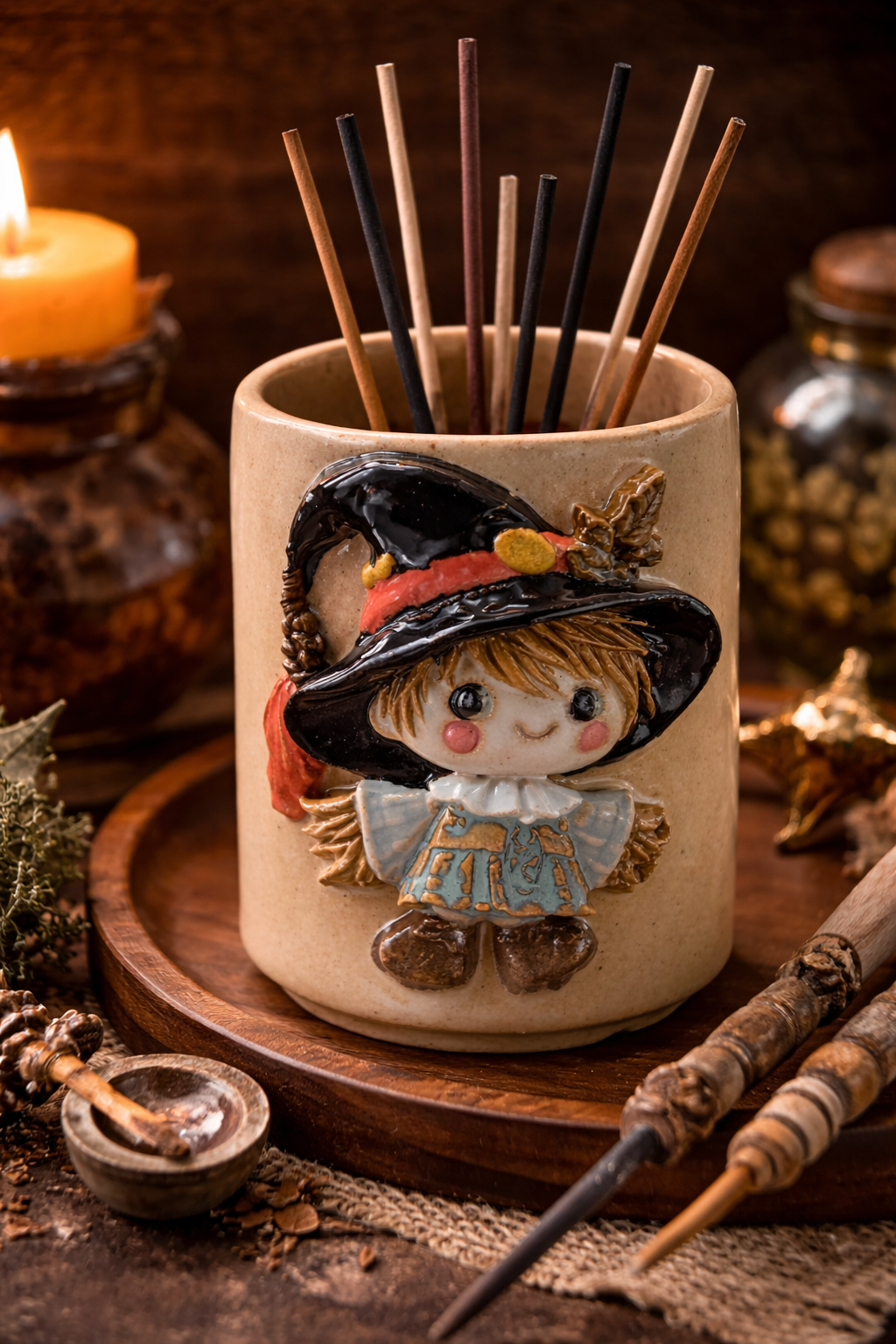 Apresentamos esse lindo porta-incenso artesanal em cerâmica com tema bruxinha espantalho — uma peça única que transforma qualquer ambiente em um cantinho místico e acolhedor